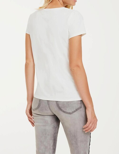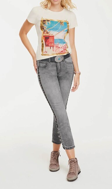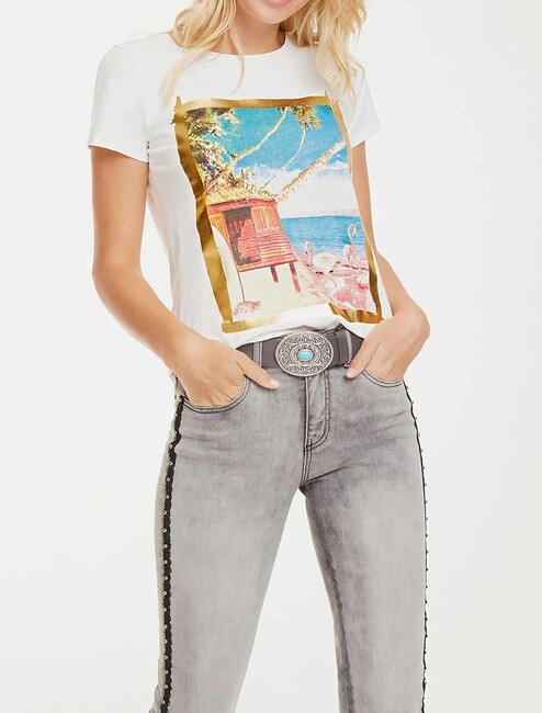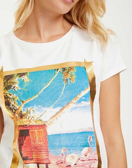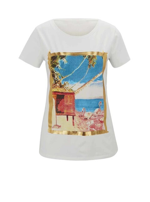 Čistý dovolenkový pocit! Skvelé tričko od Linea Tesini hneď zaujme svojim ležérnym dizajnom s prepracovaným tlačeným motívom vpredu v lesklom zlatom ráme. Silueta obopínajúca postavu s okrúhlym výstrihom a krátkymi rukávmi. Dĺžka 64 cm (veľkosť 42). Pohodlný džersej vyrobený z 95 % bavlny (Bavlna vyrobená v Afrike)/5 % elastanu.
