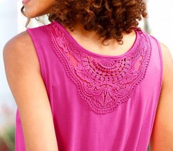 Základ milujúci detaily, ktorý sa hodí ku všetkému. Žensky navrhnutý džersejový top od Witt Weiden v atraktívnom dlhom štýle s pútkami na opasok na bokoch a spleteným zaväzovacím opaskom so strapcovými detailmi. Vrcholom je farebne zladená vsadka na chrbte z kvalitnej priehľadnej čipky. Lemovaný okrúhly výstrih s malým riasením vpredu. Priliehavé postave s pohodlnými širokými ramienkami.Dĺžka 76 cm. Mäkký džersej vyrobený z 50 % bavlny (bavlna vyrobená v Afrike)/50 % modalu, čipka vyrobená z 90 % bavlny/10 % polyamidu.