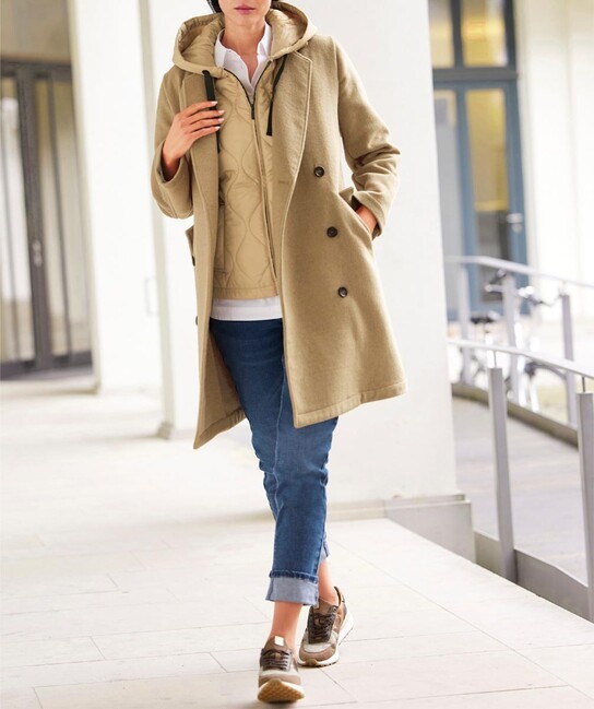 To je super? Jeden kabát, viacero spôsobov nosenia – nový vzhľad každý deň. Teplý kabát vo všestrannom štýle dva v jednom s prešívanou vestou, nositeľný spolu alebo samostatne. Ak hľadáte klasický biznis štýl, dvojradový flísový kabát s klopovým golierom, klopovými vreckami a zadným rozparkom je presne to, čo potrebujete. Pre ležérny vzhľad si oblečte prešívanú vestu s kapucňou a zaväzovaním, zipsom a vreckami pod ňou, alebo pre chladnejšie chvíle a športový štýl ste perfektne vybavení prešívanou vestou. Rovný strih. Dĺžka kabáta 96 cm, dĺžka vesty 62 cm. Tento kabát s flísovou podšívkou je vyrobený z 50 % polyesteru/30 % vlny/10 % polyakrylu/5 % polyamidu/5 % viskózy. Vrchný materiál vesty, podšívka a výplň: 100 % polyester.Výrobca: AproductZ GmbH; Adresa: Werner-Otto-Straße 1-7, 22179 Hamburg, DE; E-mail: customer-service@aproductz.com