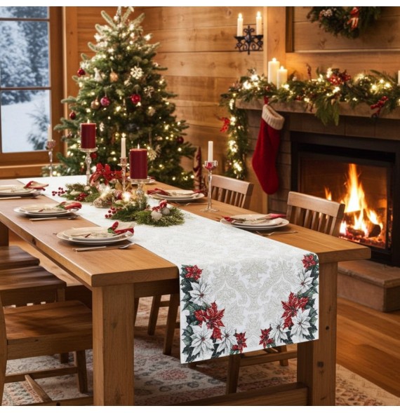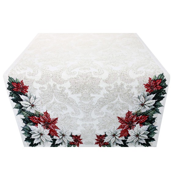 Elegantný vianočný gobelínový behúň na stôl s bohatým vzorom vianočnej girlandy a jemným lurexovým leskom. Dokonalý doplnok na ozdobenie vášho domova počas sviatočného obdobia, ktorý prinesie tradičnú atmosféru a luxusný vzhľad do každej miestnosti.