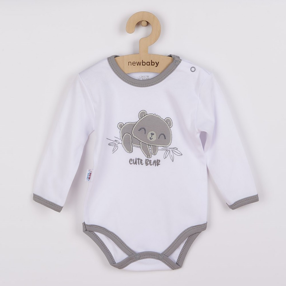 Dojčenské body s dlhým rukávom New Baby Cute Bear. Body zdobí vyšitý obrázok medvedíka. Obrázok je podlepený látkou proti poškriabaniu. Zapínanie na cvočky na ramienku a medzi nožičkam. Body má okolo krčku, nožičiek a ručičiek lemovanie. Zloženie: 100% bavlna.