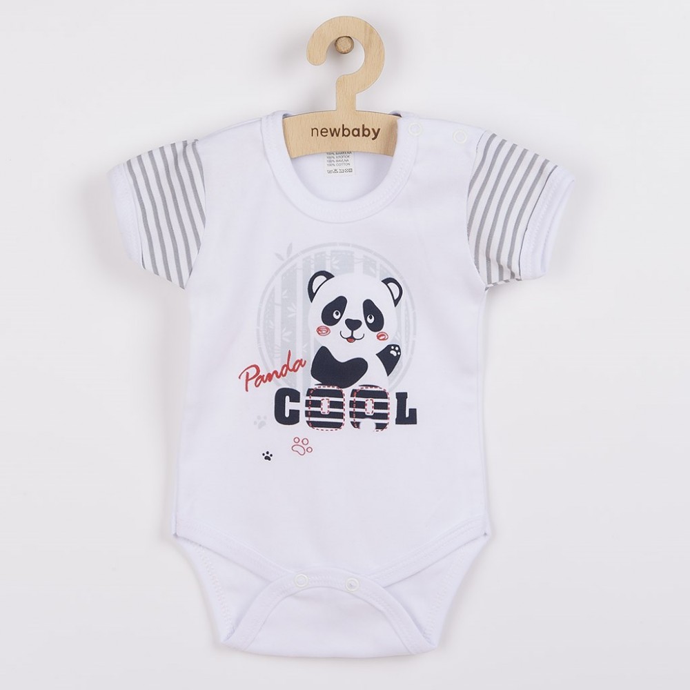 Bavlnené dojčenské body s krátkym rukávom New Baby Panda pre bábätká. Detské body má rukávky celopotlačené modernými pruhmi a predná strana je zdobená obrázkom rozprávkovej pandy a nápisom COOL. Praktické zapínanie na cvočky na ramienku a medzi nožičkami veľmi uľahčí obliekanie a prebaľovanie. Body s moderným dizajnom je vhodné pre dievčatká i chlapčekov. Zloženie: 100% bavlna.