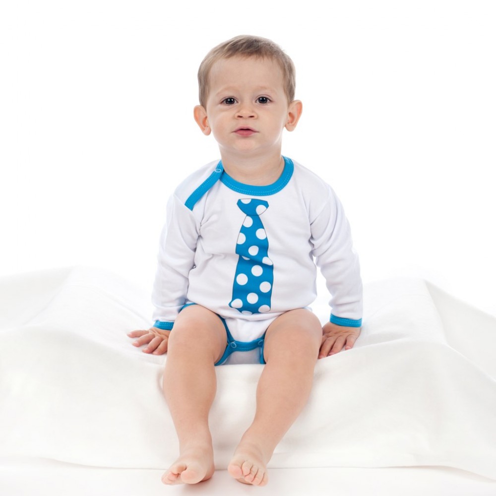 Originálne bavlnené dojčenské body s dlhým rukávom New Baby, s obrázkom tyrkysovej kravaty ozdobenej bodkami. Body má okolo krčku, nožičiek a ručičiek farebné lemovanie. Farby použité k potlači sú certifikované a vhodné pre bábätká. Je vyrobené z príjemného a kvalitného materiálu, v ktorom sa bude Vaše bábätko cítiť príjemne. Body má zapínanie na cvočky na ramienku a medzi nožičkami, čo uľahčuje obliekanie a prebaľovanie. Doprajte Vášmu bábätku vyniknúť v originálnom body. Zloženie: 100% bavlna. Rozmery: obvod okolo hrudníka cca 46 cm, dĺžka rukáva cca 24 cm, celková dĺžka cca 40 cm.