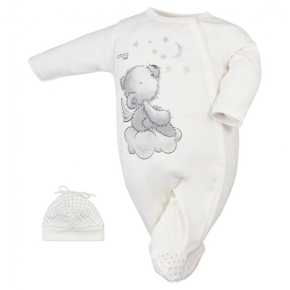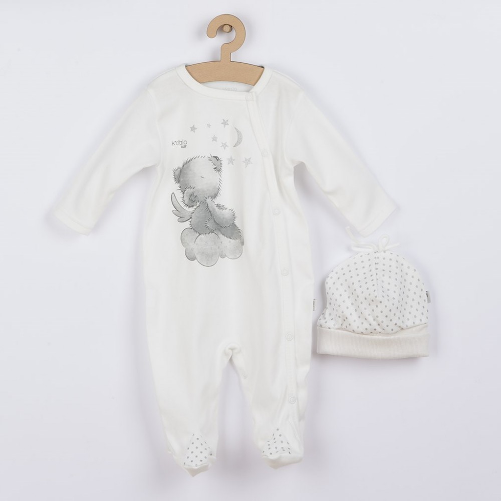 Očarujúci a jemný bavlnený dojčenský overal s čiapočkou Koala Angel. Overal má moderné bočné zapínanie na cvočky po celej dĺžke a medzi nožičkami. Je vhodný pre bábätká už od narodenia pre svoju jemnosť a mäkkosť. Overal je zdobený obrázkom medvedíka. Čiapočka so širším lemom krásne kryje ušká a je celopotlačená bodkami. Overal s čiapočkou je vyrobený z príjemného a kvalitného bavlneného materiálu, v ktorom sa bude Vaše bábätko cítiť príjemne. Zloženie: 100% bavlna.