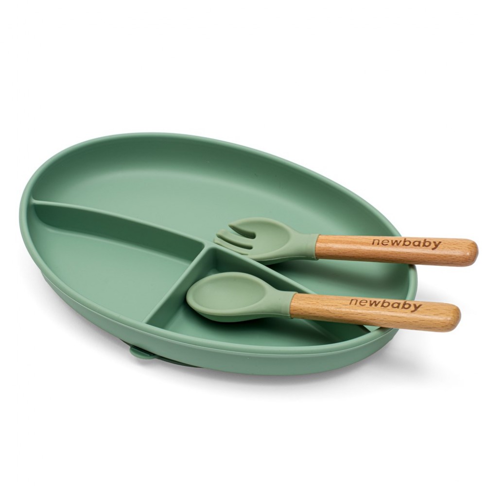 - Lyžičku a vidličku s drevenou rukoväťou a jemným gravírovaním loga New Baby (dĺžka 14 cm) – príjemné na dotyk a prispôsobené malým ručičkám.