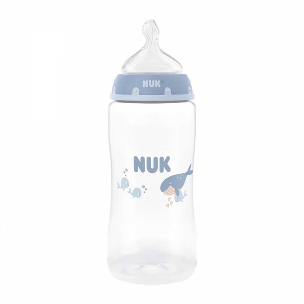 Dojčenská fľaša NUK First Choice s kontrolou teploty. Špeciálny tvar typický pre cumlík NUK s ortodontickým antikolikový cumlíkom je modelovaný podľa materskej bradavky pri dojčení. Dojčenské fľaše sú teraz vybavené novou NUK kontrolkou teploty a pomáhajú tak zabrániť tomu, aby vaše dieťa pilo príliš horúci príkrm. Kontrolka vyzerá ako teplomer, je umiestnená medzi ryskami a teplota obsahu fľaše zmení jej farbu. Ak je príkrm príliš horúci, modrá kontrolka sa zmení na bielu. Vyrobená z vysoko kvalitného nerozbitného plastu polypropylénu a neobsahuje BPA (Bisfenol A). Obsah fľaše 300 ml. Vhodná pre deti od 3 mesiacov M (stredne veľký otvor = pre detskú výživu). Klinicky testované.