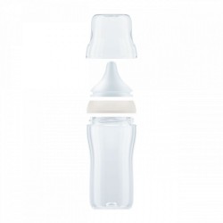 Sklenená dojčenská fľaša NUK Perfect Match s kontrolou teploty a mäkkým silikónovým cumlíkom. Špeciálny tvar typický pre cumlíky NUK s ortodontickým antikolikovým cumlíkom je modelovaný podľa materskej bradavky pri dojčení. Ponecháva dostatok priestoru pre prirodzené sacie pohyby jazyka aj čeľuste. Veľká, široká opora pier pri pití pripomína matkinu pokožku. Fľaša je navrhnutá tak, aby bábätko neprišlo do kontaktu s pevnými plastovými časťami. Vylepšený systém proti prehĺtaniu vzduchu pri pití Anti Colic Air System zabezpečuje prirodzený tok mlieka, aby dieťa pilo uvoľnene bez prehĺtania vzduchu. Hladko sa zužujúci tvar s antikolikovou funkciou pre plynulý a nerušený prietok pitia, veľkosť M (od 3 m, pre materské mlieko). Dojčenské fľaše sú teraz vybavené novým NUK kontrolným ukazovateľom teploty, ktorý pomáha zabrániť tomu, aby vaše dieťa pilo príliš horúci príkrm. Ukazovateľ vyzerá ako teplomer, je umiestnený medzi ryskami a teplota obsahu fľaše zmení jeho farbu. Ak je príkrm príliš horúci, modrý ukazovateľ sa zmení na biely. V ideálnom prípade by mal príkrm mať telesnú teplotu (37 °C), čo zodpovedá modrému zafarbeniu displeja. Vyrobená z vysoko kvalitného skla a neobsahuje BPA (Bisfenol A). Obsah fľaše 230 ml. Vhodná pre deti od 3 m, veľkosť M (od 3 m = pre materské mlieko). Klinicky testované.
