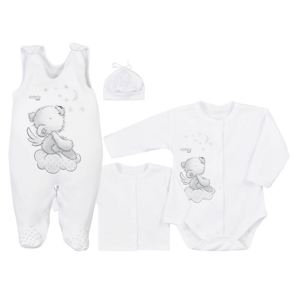 Nádherná bavlnená dojčenská 4-dielna súpravička Koala Angel pre bábätká. Súpravička je vyrobená z veľmi príjemného, mäkkého a kvalitného materiálu, ktorý je vhodný pre bábätká a je vhodná nielen do pôrodnice. Obsahuje body s dlhým rukávom, dupačky, kabátik a čiapočku. Celorozopínacie body zdobí obrázok medvedíka. Dupačky zdobí obrázok medvedíka a zapínanie je na cvočky na ramienkach a medzi nožičkami. Kabátik je jednofarebný so zapínaním po celej dĺžke. Čiapočka je zdobená bodkami a po obvode má široký pružný lem, ktorý netlačí na hlavičku bábätka a krásne kryje ušká bábätka. V tejto súpravičke, ktorá je precízne a kvalitne ušitá sa bude bábätko cítiť veľmi príjemne. Zloženie: 100% bavlna.