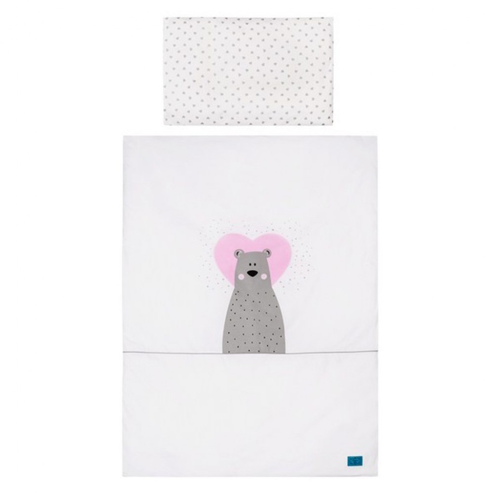 Detská bavlnená 6-dielna súprava do postieľky Belisima Bear in love pre bábätká. Súprava je z jednej strany celopotlačená srdiečkami a druhá strana je zdobená obrázkom zamilovaného medvedíka. Je vyrobená z mäkkého, príjemného materiálu. Súprava obsahuje obliečky na vankúšik cca 40x60 cm, obliečky na paplón cca 100x135 cm, mantinel cca 180 cm, vankůš a paplón, baldachýn. Materiál 100% bavlna.