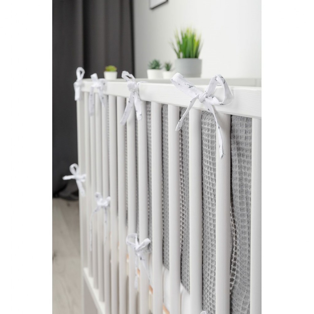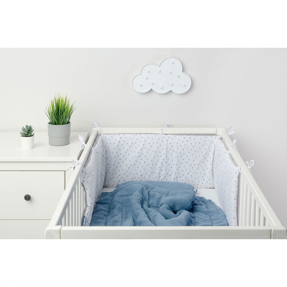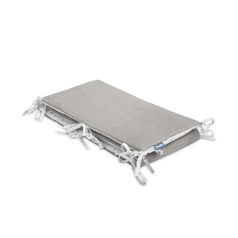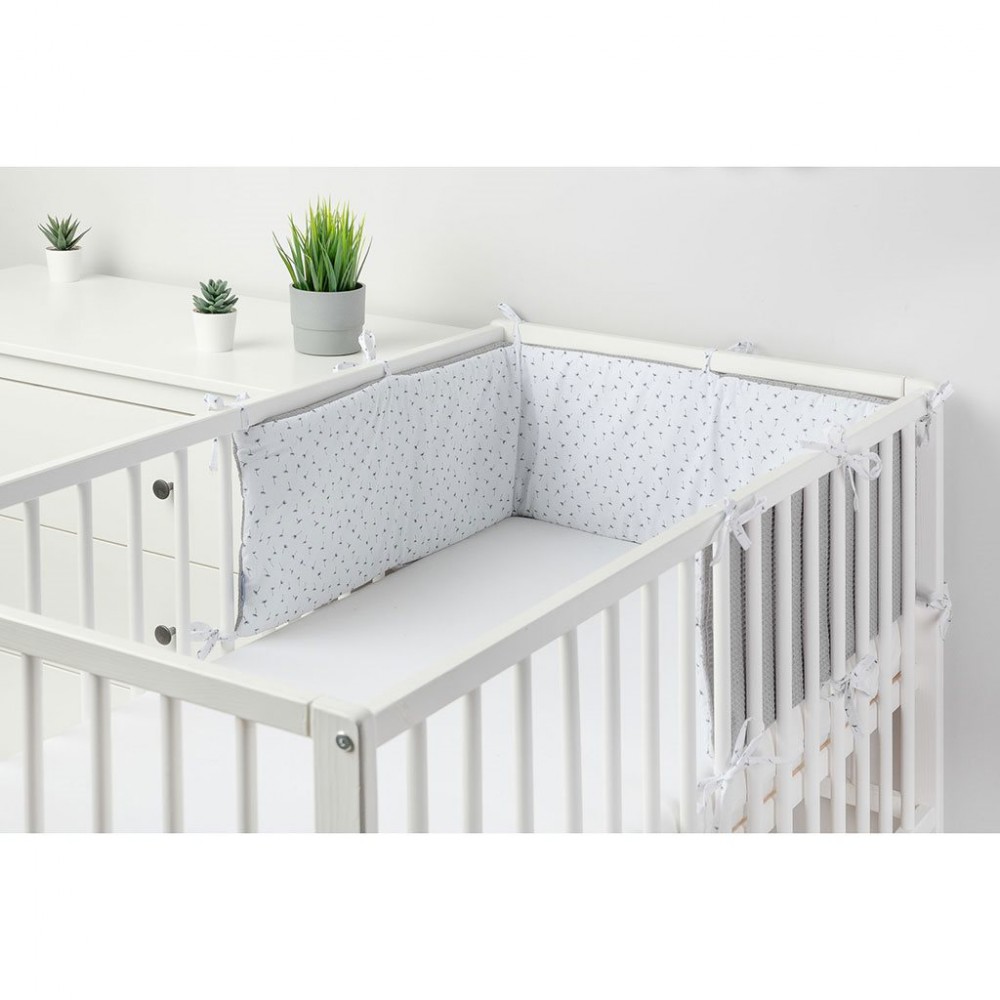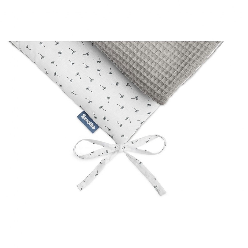 Tenký mantinel do postieľky od Sensillo je alternatívou k veľkým a ťažkým mantinelom bežne používaným v detských postieľkach. Tenká antialergická výplň poskytuje dostatočnú izoláciu, chráni dieťa pred zranením pri pohybe po postieľke a predovšetkým je bezpečná a minimalizuje riziko udusenia. Jedinečný vzhľad nárazníka tvorí kombinácia dvoch materiálov. Jedna strana je vyrobená z mäkkej a na dotyk príjemnej bavlny s vaflovou štruktúrou a druhá strana je vyrobená z bavlny s farebnou potlačou. Obe látky majú certifikát Oeko-Tex. Každých 30 cm sú všité pásiky, ktoré pre upevnenie zaisťujú držanie mantinelu v správnej polohe. Mantinel má nielen praktickú funkciu, ale je aj ozdobou detskej izby. Bol navrhnutý pre postieľku s rozmermi 120x60 cm.