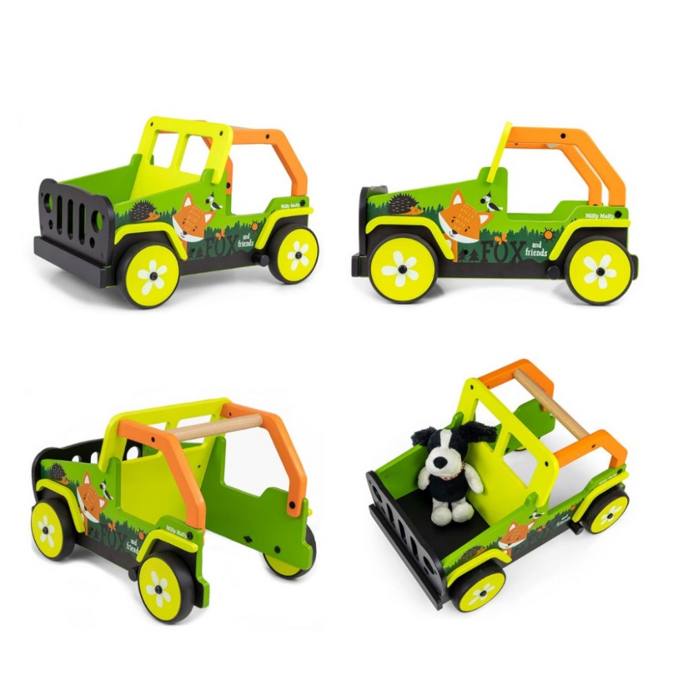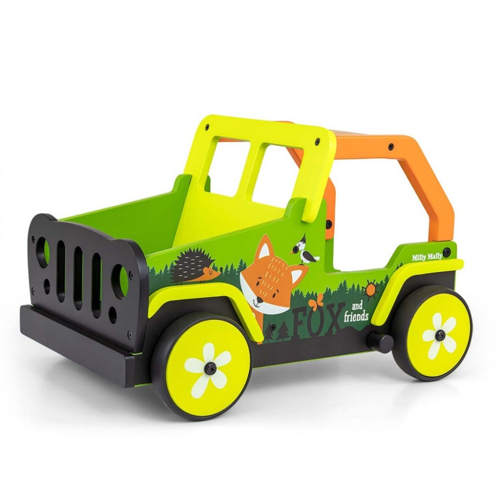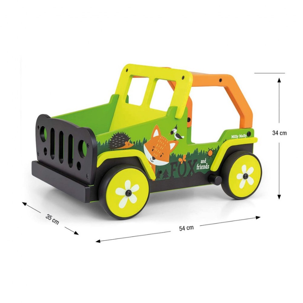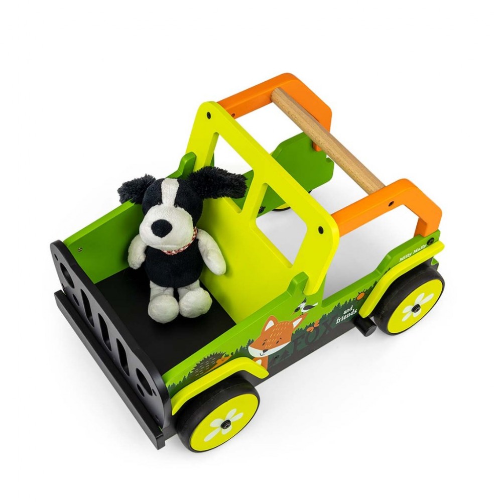 Toto detské chodítko, inšpirované legendárnymi terénnymi autami, je vyrobené z vysoko kvalitného dreva a ekologických materiálov. Kryty kolies sú vyrobené z mäkkého TPR plastu, ktorý je flexibilný a odolný a umožňuje použitie na všetkých povrchoch bez poškodenia alebo poškriabania. Neobsahujú zmäkčovadlá a sú šetrné k životnému prostrediu.