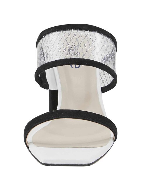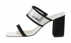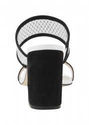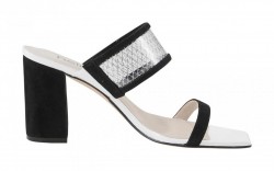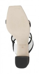 S týmito elegantnými sandálkami to bude vzrušujúce. Všestranný ušľachtilý spoločník v puristickom čiernobielom vzhľade vyrobený z mäkkej napa kože a semišu a priehľadnej syntetickej lakovanej kože s decentne integrovanými trblietavými odleskami. Priehľadný remienok s bočnou strečovou komfortnou vložkou a krytým blokovým podpätkom, výška 9 cm. Polstrovaná kožená stielka. syntetická podošva.