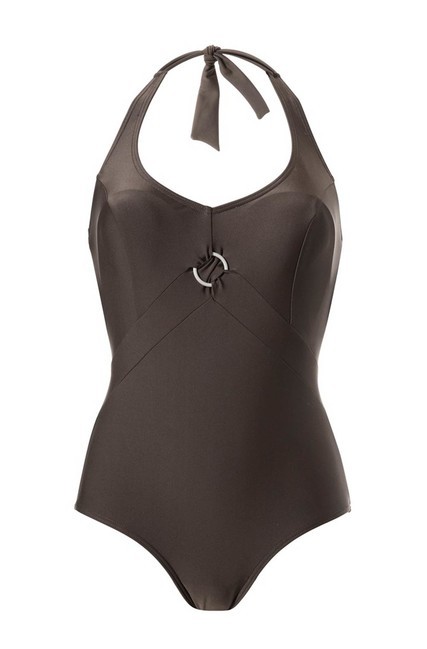 Štýlové zoštíhľujúce plavky. Módne viazanie okolo krku s ozdobným krúžkom na výstrihu. Predný diel s vnútornými integrovanými mäkkými košíčkami s poprsnou gumou vpredu a tvarujúcou brušnou výstelkou. Podšité v zadnej časti.zvršok vyrobený z 80% polyamidu / 20% elastanu. 100% polyamidová podšívka, podšívka zo sieťoviny vyrobená z 84% polyamidu / 16% elastanu