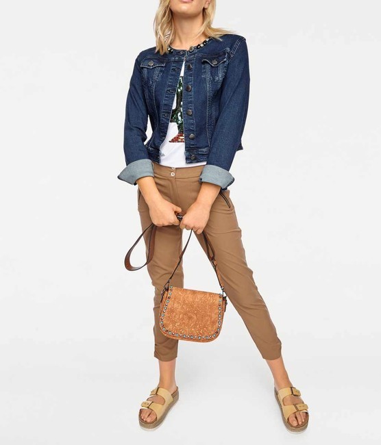 Kreatívne navrhnutá taška z kvalitnej imitácie kože s reliéfnym celoplošným kvetom. Zvláštne zvýraznenie - nápadne cvoky a orezávané drahokamy. Kontrastne farebné lemovanie šikovne dopĺňa štýlový vzhľad. Nastaviteľná dĺžka, odnímateľné ramienko a skryté zapínanie na gombíky. Vonkajšie vrecko na zips na zadnej strane. Vnútorný zips a vrecko.D / V / Š cca 23/20/7 cm100% polyuretán, podšívka zo 100% polyesteru