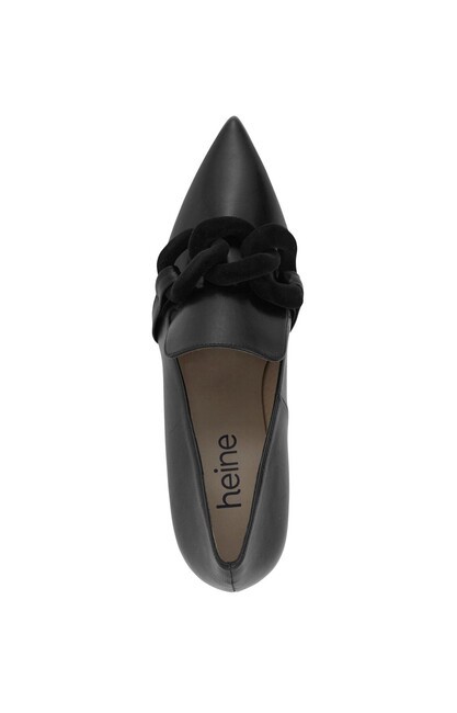 Neodolateľné! Lodičky ručne vyrábané v Španielsku. Ženský štýl s ozdobným, zamatom potiahnutým retiazkovým prvkom a flexibilnou podrážkou. Vyrobené z mäkkej napa kože s elegantným krytým ihličkovým podpätkom, výška 7 cm. Podšívka: syntetika, polstrovaná stielka: koža. Syntetická podrážka.