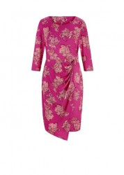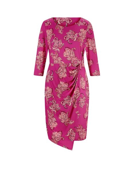 Ružová je módna nevyhnutnosť. Obľúbené šaty na každú príležitosť! Obtiahnutý vzhľad lichotiaci postave sa spája s atraktívnym paisley dizajnom! S 3/4 rukávmi, okrúhlym výstrihom a módnym, asymetrickým špicatým spodným lemom. Riasenie krásne padne. Elastické a pohodlné na nosenie. Lichotivé postave s pásovým švom. Dĺžka 100 cm. Mäkký džersej a čiastočná podšívka z 95% polyesteru/ 5% elastanu.