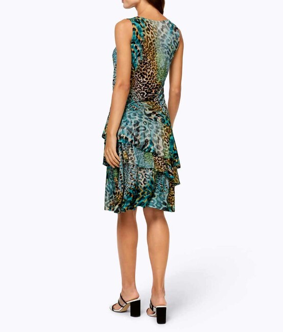 Nápaditý štýl vyžaruje čistú radosť zo života. Očarujúce džersejové šaty v temperamentnej farebnej kombinácii. Atraktívny pútač v zvieracom dizajne! Štýl bez rukávov s módne širokými ramienkami, bočnými volánmi a sukňou s hravým stupňovitým volánom. Jemne padavý džersej vyrobený zo 100% viskózy. Dĺžka 104 cm.