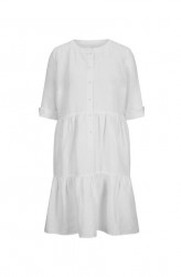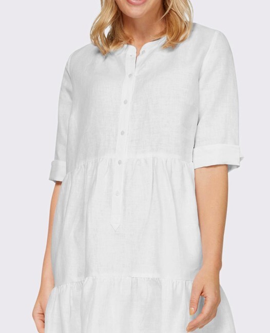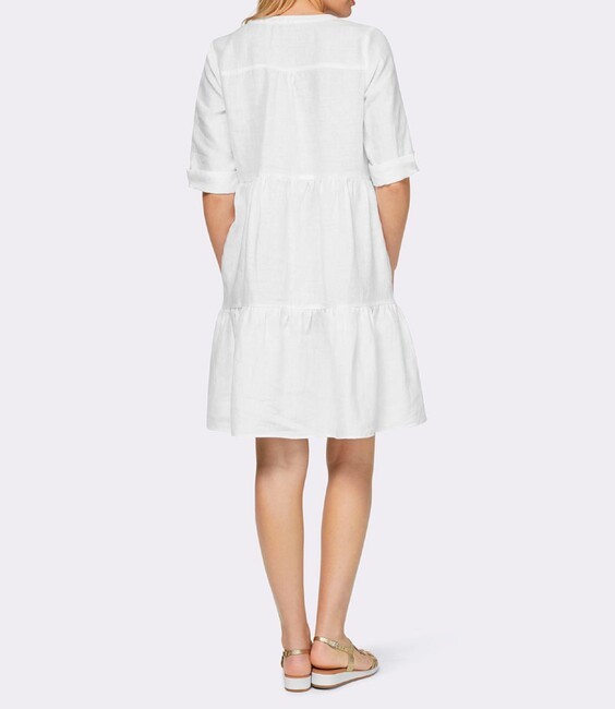 Neprekonateľne ležérne a elegantné zároveň. Módny zážitok s najvyššou úrovňou pohodlia vyrobený zo 100% ľanu. Najmodernejšie v módnej šírke a s hojdacou stupňovitou sukňou. Okrúhly výstrih s gombíkovou légou až po boky, krátke rukávy s rozparkovanými manžetami. Očarujúca A-silueta. Dĺžka 96 cm.