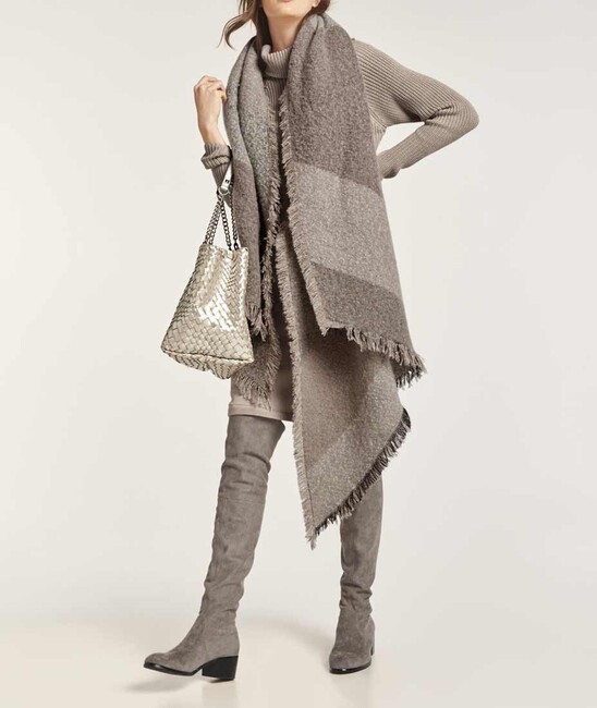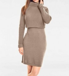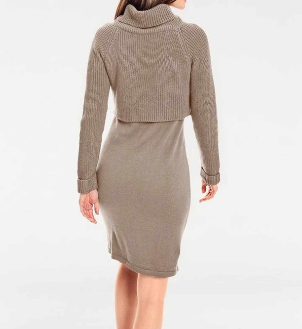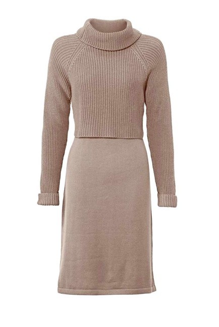 Jednoduché, elegantné a ženské s presvedčivým vzhľadom dva v jednom. Pletené šaty lichotiace postave v módnom vrstvenom vzhľade s ležérnou vrchnou vrstvou vo svetrovom vzhľade. Priliehavý rolák a pevné manžety. Fascinujúca zmes úpletu z hrubého pleteného svetra a hladkých úpletových šiat. Dĺžka nad kolena. Priliehavé postave.Dĺžka 102 cm. Mäkká, hrejivá zmes materiálu 50% bavlna / 50% polyakryl.