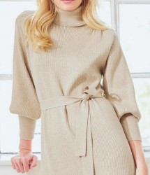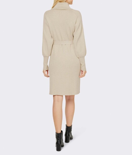 Nenápadný a predsa neodolateľný – športový luxus demonštruje absolútny zmysel pre štýl. Nádherné pletené šaty vyrobené z vysokokvalitnej zmesi bavlny, ktorá je mimoriadne príjemná na nosenie. Hrejivý rolák. Riasenie na ramennom sedle. Široké dlhé rukávy so širokými manžetami. Pútka na opasok a viazacie opasky. Rovný tvar. Dĺžka 100 cm. Mäkký rebrovaný úplet vyrobený z 52 % viskózy / 36 % bavlny / 12 % elastanu