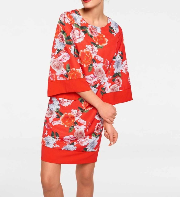 Horúci trend v temperamentnej červenej farbe. Tento ušľachtilý model boduje s nevyváženosťou a zároveň so ženskou sofistikovanosťou. Vrcholom je očarujúca všestranná kvetinová potlač a módne 3/4 trubkové rukávy. Jednofarebné lemovanie na rukávoch. Priliehavé postave s klasickým okrúhlym výstrihom a zapínaním na krku. dĺžka 95 cm, jemná padavá kvalita vyrobená zo 100% polyesteru