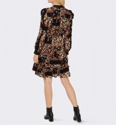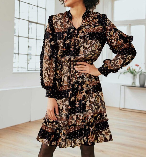 Tieto šaty vás zahalia krásou a eleganciou! Očarujúce šaty s potlačou V aktuálnom paisley dizajne s trblietavou priadzou. Top s hravými volánikmi na ramene a dlhými rukávmi s manžetou na gombíky. Výstrih do V s malým stojačikom a zaväzovaním. Elastický pás. Priliehavá sukňa s volánom a volánom na leme. Dĺžka 100 cm. Ušľachtilá krepová kvalita vyrobená z 94 % polyesteru/6 % metalizovaných vlákien. Podšívka zo 100% viskózy.