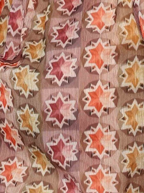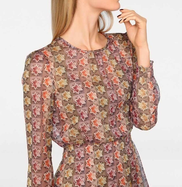 Elegantný mestský vzhľad pre ženy a pútavá potlač v štýle New Graphics. Vyrobené z jemného šifónu s priliehavým topom a zvonovou sukňou. Okrúhly výstrih s malým rozparkom so zapínaním na pútko vzadu pri krku. Poťahové vsadky v páse a na lemoch rukávov. Priliehavé postave. Dĺžka 94 cm. Mierne priehľadný šifón vyrobený zo 100% polyesteru. Nepriehľadná podšívka zo 100% polyesteru.
