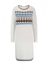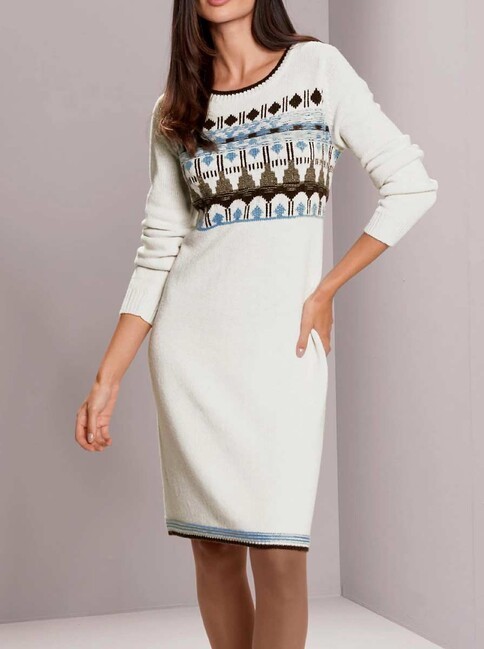 Skvelé hrejivé, pletené šaty od Ricka Cardony z kvalitného žakárového úpletu s atraktívnym vzorom s vpletenými lesklými zlatými mini flitrami. Kontrastné farebné lemy na rebrovanom krku a spodnej časti. Dlhé rukávy s manžetami z rebrovaného úpletu. Vzadu krátky zips. Silueta obopínajúca postavu. Dĺžka 102 cm (veľkosť 40). Nádherne mäkký úplet vyrobený z 33% polyakrylu/33% polyamidu/29% vlny/5% polyesteru.