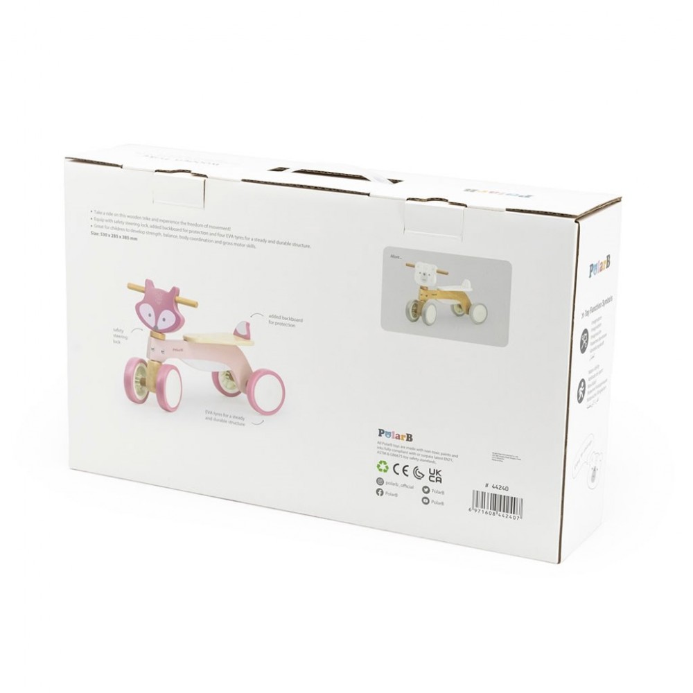 Toto roztomilé drevené odrážadlo v tvare medveďa zaručuje bezpečné hranie vďaka pevnej drevenej konštrukcii a odolným EVA pneumatikám, ktoré zabezpečujú plynulý pohyb.