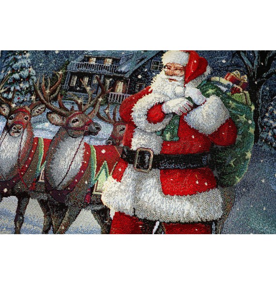 Táto nádherná vianočná gobelínová obliečka na vankúš prinesie do vášho domova čarovnú atmosféru sviatkov. Na obliečke je vyobrazený ikonický motív Santa Clausa s vreckom plným darčekov, ktorý stojí vedľa dvoch majestátnych sobov. Scéna je doplnená zasneženým nočným prostredím a osvetleným domčekom v pozadí.