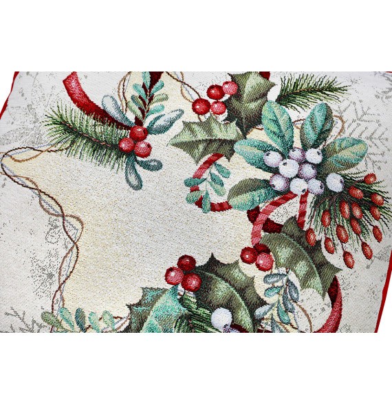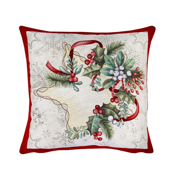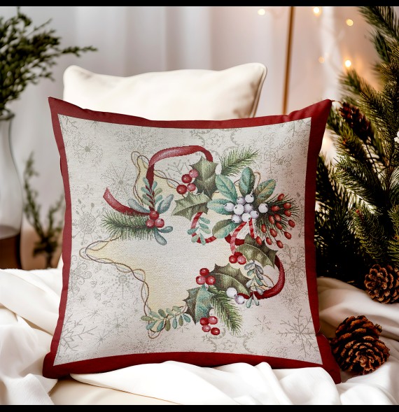 Vytvorte si doma sviatočnú náladu s touto elegantnou vianočnou gobelínovou obliečkou na vankúš. Jemný motív cesmíny, červených bobúľ a zelených vetvičiek, previazaný dekoračnou červenou stuhou, navodzuje atmosféru pokoja a radosti.
