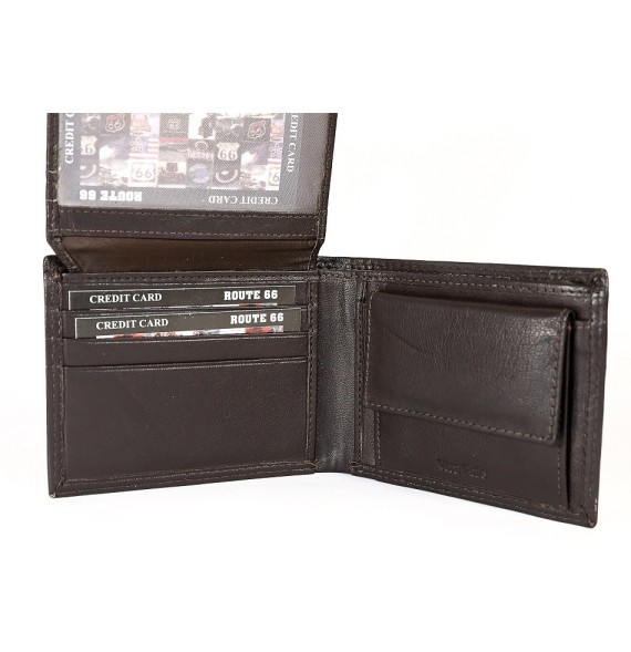 Pánska kožená peňaženka ROUTE 66. Formát peňaženky je na šírku s vnútorným vyklápaním nahor. Vyrobená z hladkej kože s jemnou štruktúrou. Vytlačené logo na prednej strane peňaženky s vystuženou prednou stenou. Peňaženka je dodávaná spolu s elegantnou potlačenou krabičkou.