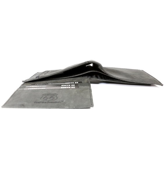 Pánska kožená peňaženka ROUTE 66. Formát peňaženky je na šírku s vnútorným vyklápaním nahor. Vyrobená z hladkej kože s jemnou štruktúrou. Vytlačené logo na prednej strane peňaženky s vystuženou prednou stenou. Peňaženka je dodávaná spolu s elegantnou potlačenou krabičkou.