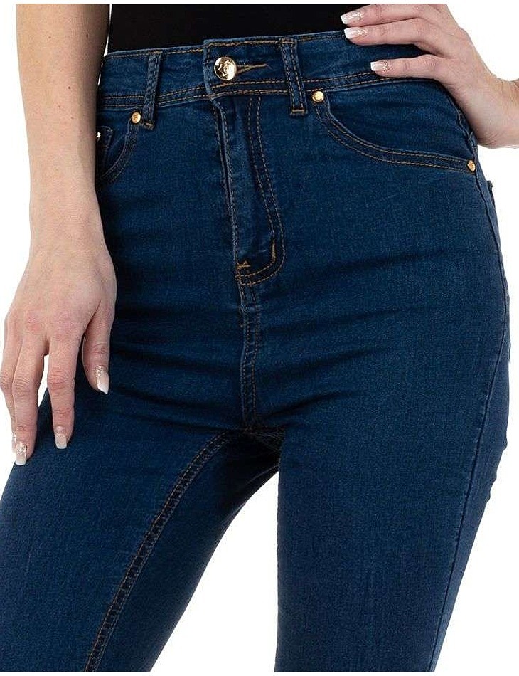 Dámske jeansové nohavice v tmavo modrom prevedení. Modelka meria 169cm konfekčnú veľkosť má XS, na fotke má veľkosť 26.