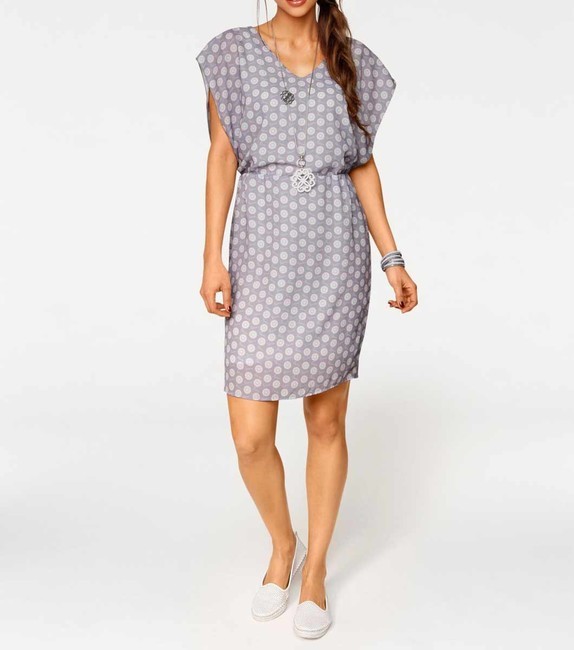 Skvelé šaty ideálne pre horúce letné dni. Trendy vzhľad s veľkými celoplošnými bodkami a zvodnými detailami. Hlboký chrbtový výstrih s ozdobnou stuhou a pružným pásom. dĺžka cca 94 cm jemne padavá kvalita zo 100% polyesteru, podšívka zo 100% polyesteru