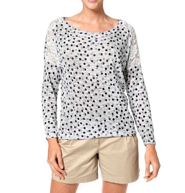 Ženský jemný pletený pulóvrik s trendovou potlačou v dvojfarebnom dizajne. Ramená s čipkami. Módny strih, dlhšie vzadu. dĺžka cca 70 cm, meraná na veľkosti 44/46 mäkký jemný úplet z 50% viskózy / 50% polyesteru, 100% polyesterová čipka
