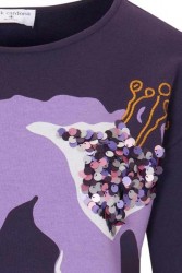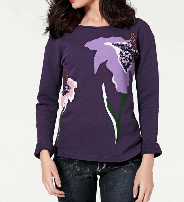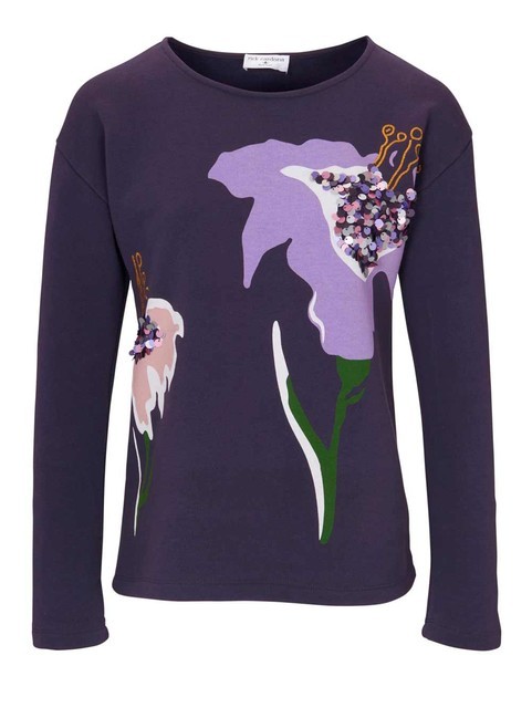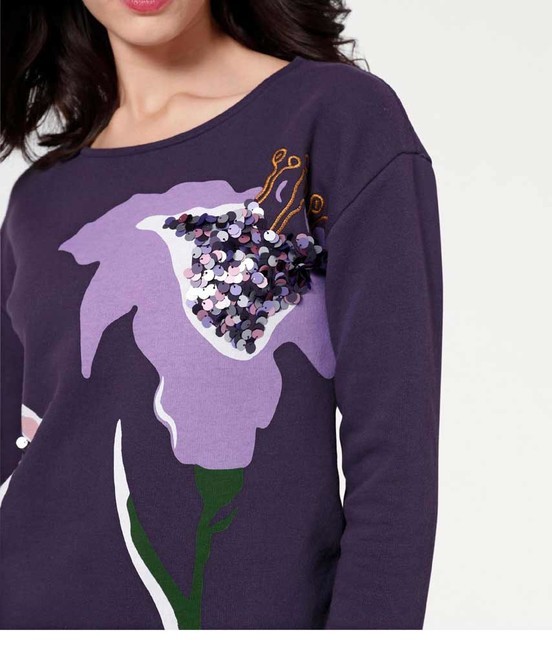 Mikina v trendovej fialovej farbe má jasný magický štýl. S módnou potlačou, vyšívanými prvkami a tónovými flitrami. dĺžka cca 60 cm pohodlná kvalita džersej 65% bavlny (s bavlnou z Afriky) / 35% polyester