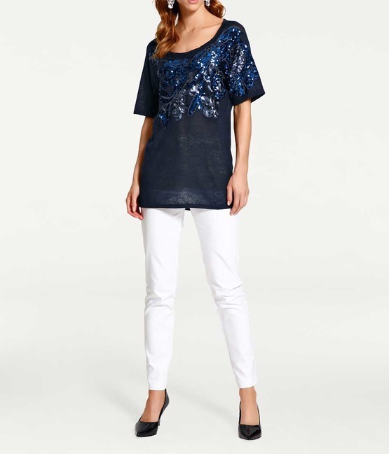 Flitre a pletenina sú dokopy skvelé duo. Klasický sveter s očarujúcou perlovouu a pergolovou výšivkou vpredu. Priliehavý strih, okrúhly výstrih a krátke rukávy. Dĺžka 64 cm. Polopriehľadný jemný úplet vyrobený z 90% polyakrylátu / 10% polyamidu.