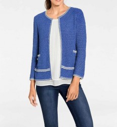 Veselý a žiarivý, krátky kardigán vyrobený z nádherne mäkkej stužkovej priadze s individuálnym dizajnom a štýlovými kontrastnými prvkami. Absolútne vhodný na vylepšenie nálady v náročný pracovný deň. V lichotivom tvare, bez zapínania v štýle saka s ženským okrúhlym výstrihom, 2 náplasťové vrecká s dekoratívnym šperkovým gombíkom. Pohodlné 3/4 dĺžkové rukávy. dĺžka cca56 cm ušľachtilý materiál: 65% polyakryl / 35% polyamid