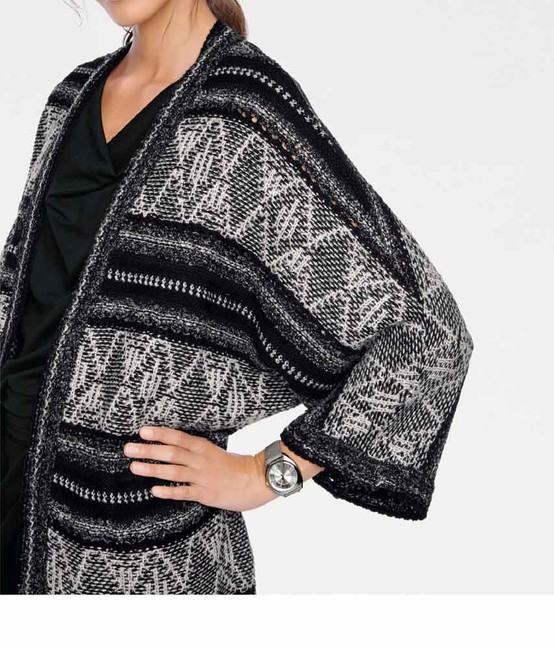 Voľnosť v pohybe v štýlovom kardigáne na chladné dni v elegantnom vzore. Výstrih v tvare V a široké rukávi.dĺžka cca 66 cmmäkká, teplá kvalita vyrobená z 73% akrylového / 27% polyesteru