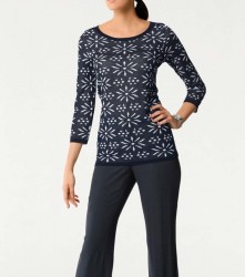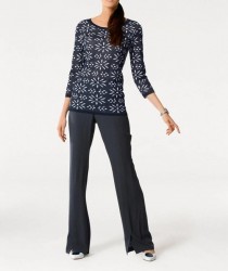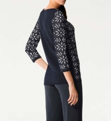 Pôvabný jemný pletený sveter Patrizia Dini v klasickej elegantnej modrej farbe, s prepracovaným lesklým žakárovým vzorom. 3/4 rukávi a rebrované manžety. dĺžka cca 64 cm nádherný úplet vyrobený z 93% viskózy / 7% polyesteru