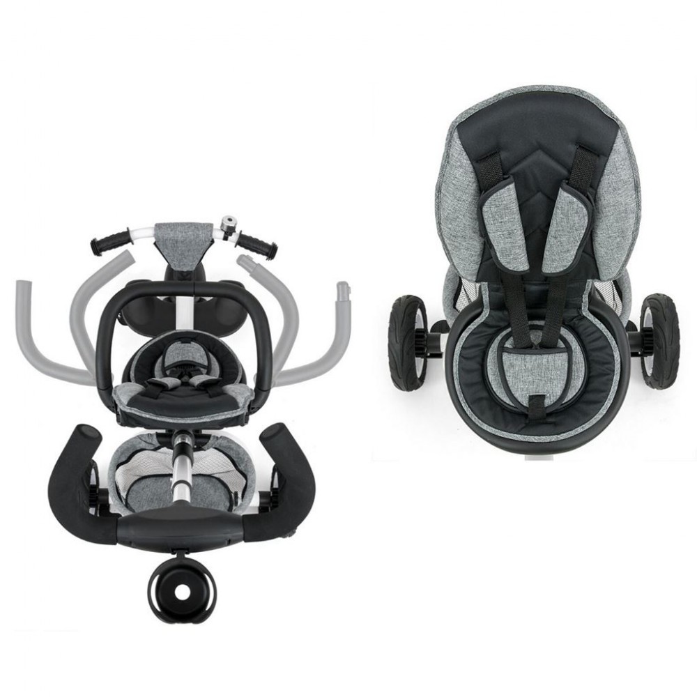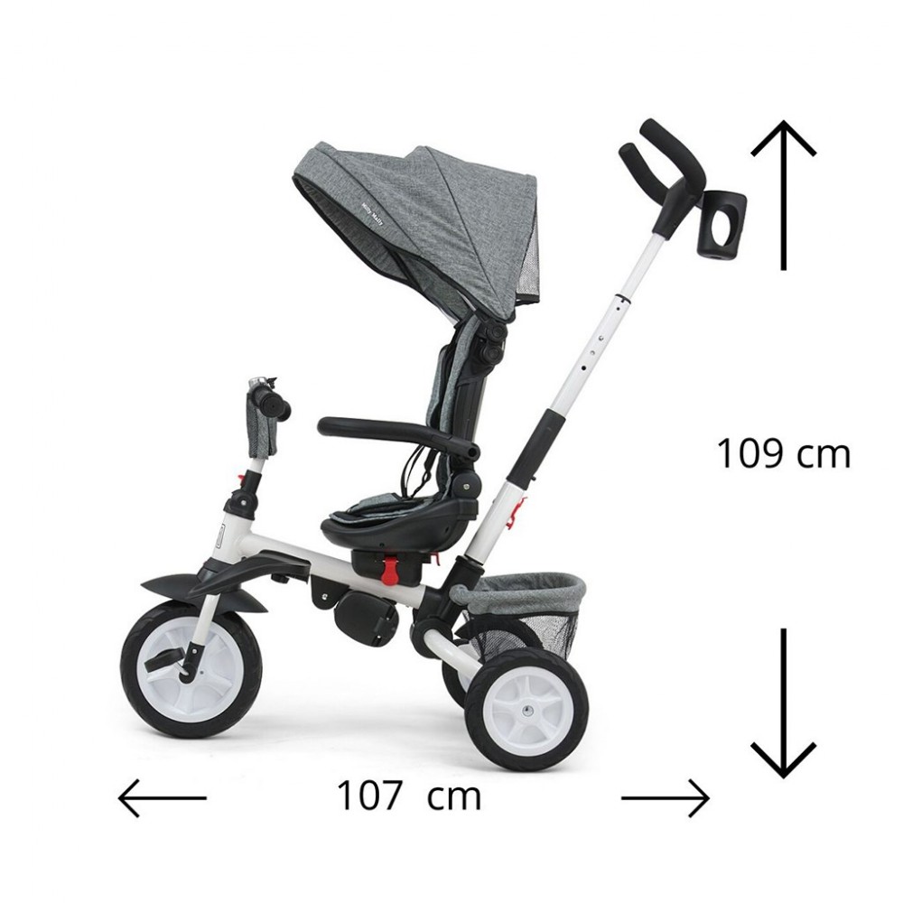 Je vyrobená z kvalitných a odolných materiálov. Má modernú konštrukciu, pohodlné a ergonomicky tvarované sedadlo, ktoré je otočné o 360 stupňov, čo umožní dieťaťu cestovať v smere alebo proti smeru jazdy. O pohodlie a bezpečie počas jazdy sa starjú bariérky, trojbodové bezpečnostné pásy, pohodlné stúpačky alebo gumové kolesá, ktoré skvele absorbujú narázy a poskytujú dobrú priľnavosť. Trojkolku môže ovládať ako dieťa, tak aj rodič pomocou nastaviteľnej rukoväte pre tlačenie. Po odobratí vodiacej tyče, sklápacej striešky, ktorá chráni pred slnkom alebo ostatných komponentov bude slúžiť ako trojkolka. Trojkolku je možné používať aj ako alternatívu golfového kočíka. Pre uloženie hračiek alebo potrieb pre dieťa je tu praktický úložný košík.